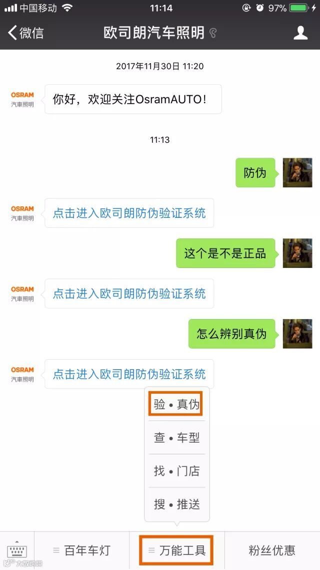 ▲ 进入【欧司朗汽车照明】微信公众号,输入关键词:【防伪】、【正品】等类似相关词,即可马上收到防伪验证系统相关链接。
