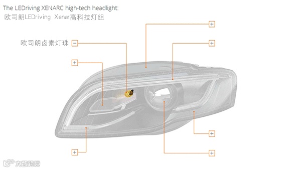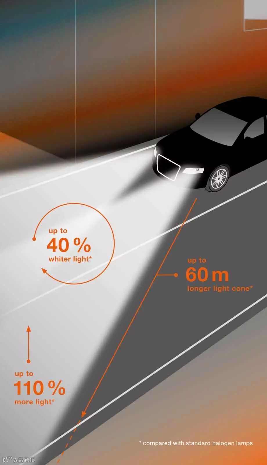 欧司朗Xenarc氙气灯能显著提升照明效果,较之于原有卤素大灯拥有更大的铺路范围和更明亮的光线,帮助司机能够更早的识别道路标志或发现任何潜在的危险。