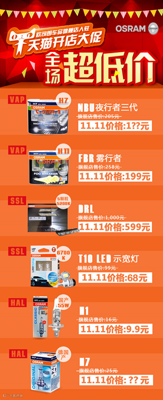 开业活动我们除了昨天小欧推荐给大家的“双11价格疯狂猜,省钱GO GO GO”外,还准备了超值折扣回馈欧司朗粉丝!天猫开店大促全场产品超低价