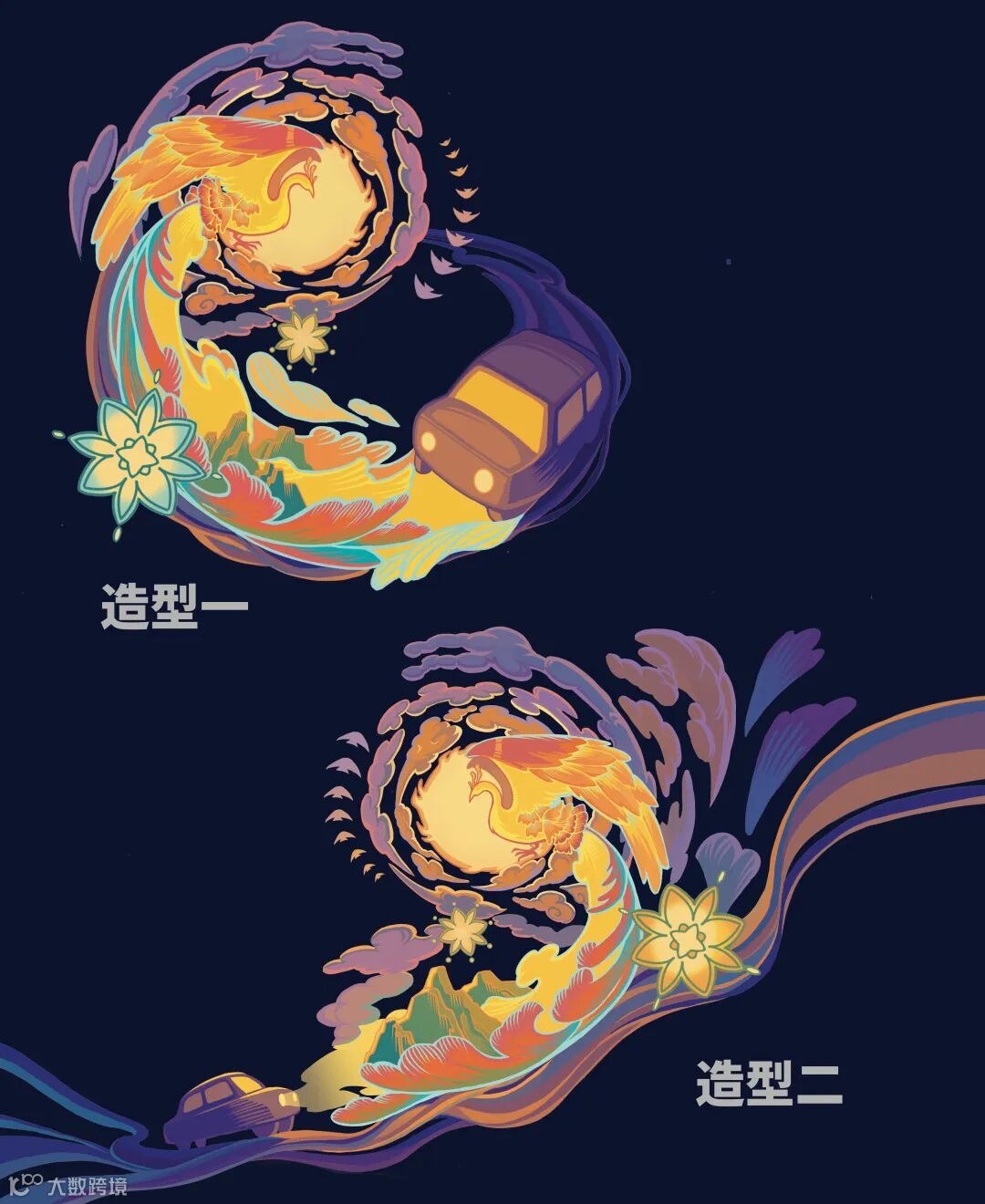 本作品的设计思路来源于车灯开启时照出的强烈光束。夜间行车时,车灯的光芒使得司机能够看清前路,犹如黑夜中的太阳。在我国古代,凤凰常被用来作为太阳的象征,所以作品中的凤凰意在体现灯光的作用与车灯在夜间极好的照明能力。