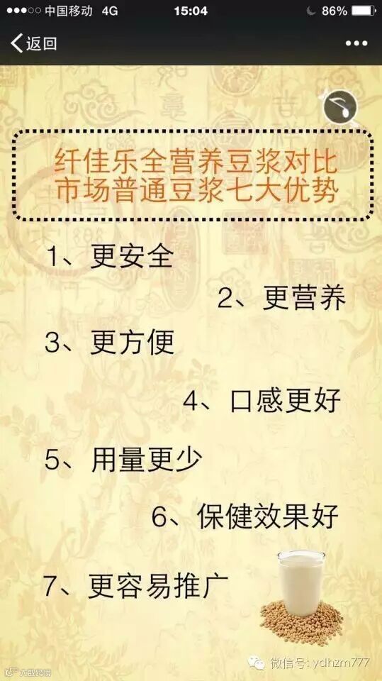7、更容易推广:(我们国家1996年的时候就推广过豆浆,但是因为里面有害成分没有推广成功,今天我们掌握了核心的技术,解决了这一大难题,谈一个客户几百、几千、几万的终端消费群体就出来了,并且每天自动自发的喝我们豆浆)。