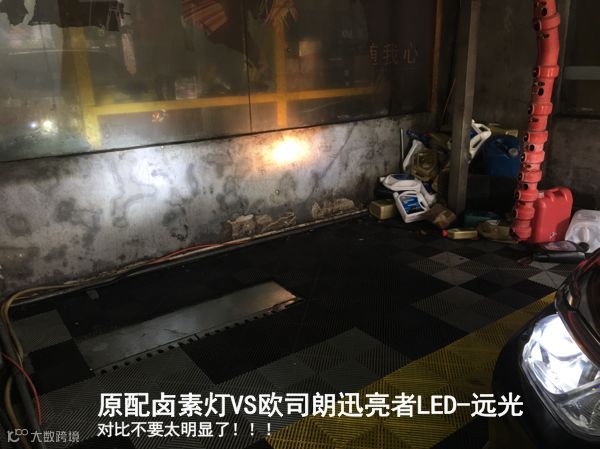 一边是原配卤素灯一边是欧司朗迅亮者的远近灯光对比,这个效果2000块钱拿下我太开心了。很明显可以看出LED灯那一边的灯光更亮眼睛更舒服,而且铺路范围也更宽了,这还只是打在墙上,如果是晚上照在路面上效果应该更加棒!