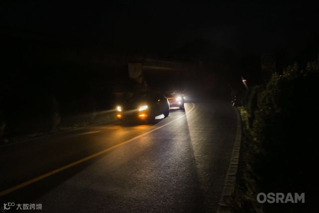 天色将暗未暗之时,在山路弯道之中,卤素灯和欧司朗HIDCBA全系列车灯照射亮度和距离不可同日而语。