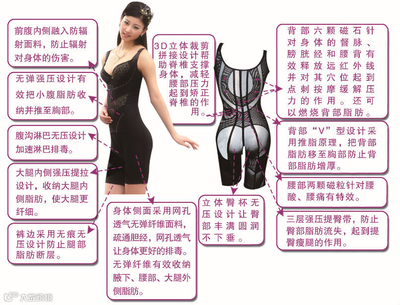 塑身内衣最重要的作用是调整人体脂肪的分布,使曲线优美。坚持穿美体内衣3-6个月,以后脂肪形成习惯,直接流向胸部和臀部,打造波涛汹涌的胸部和悬崖峭壁的屁屁。从小开始使用正确的内衣,健康的内衣,为我们的胸部保驾护航,减少胸部下垂,脂肪移位而变小,更重要防止穿错内衣带来乳腺癌,乳腺炎,乳腺増生的”凶罩”