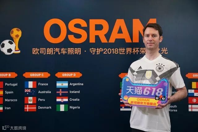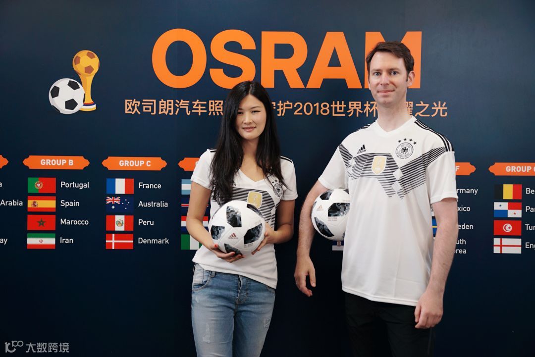 欧司朗中国区CEO Gunnar Eberhardt(右)和汽车照明中国区电商经理李之晴(左)代表欧司朗为2018世界杯助威