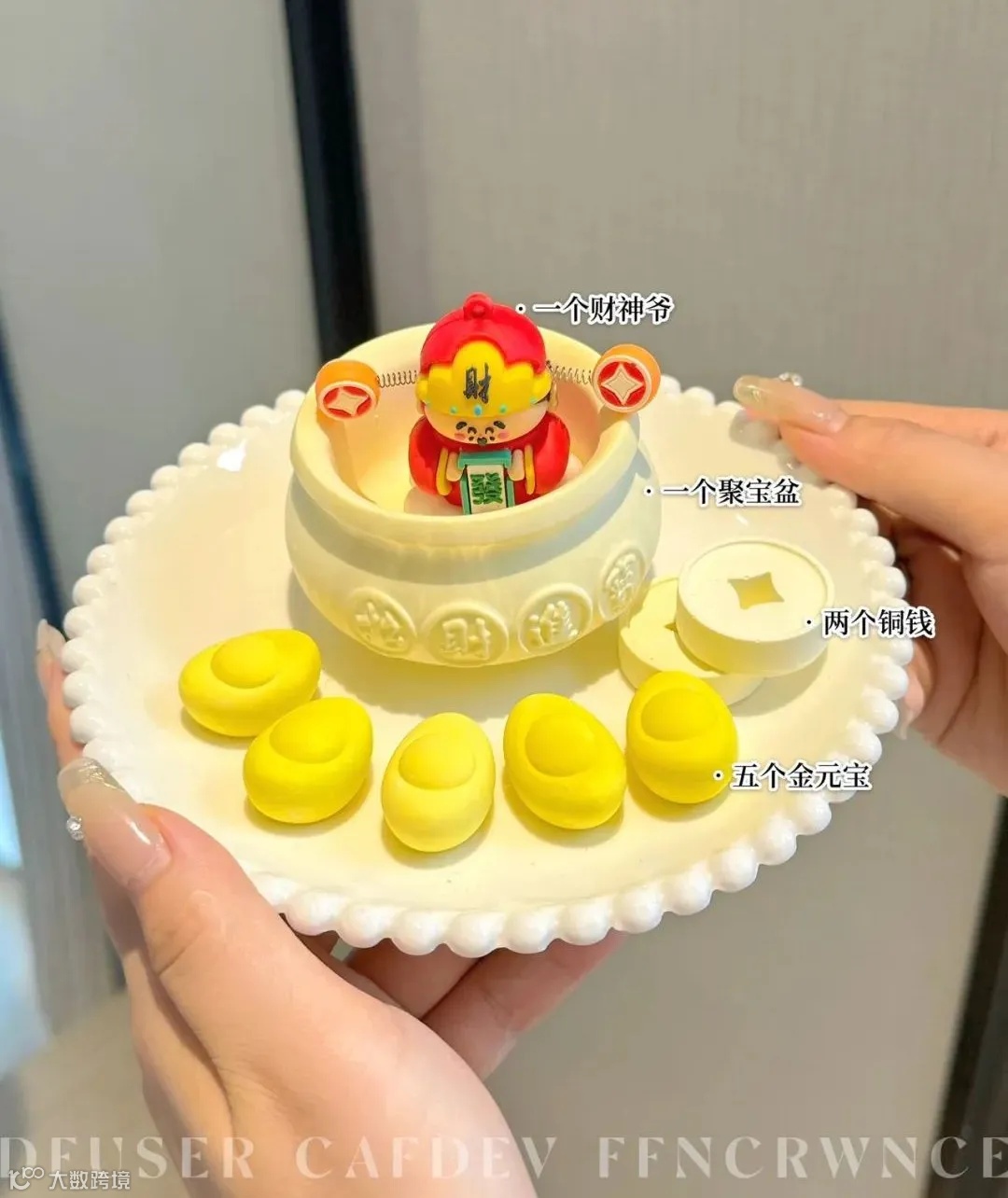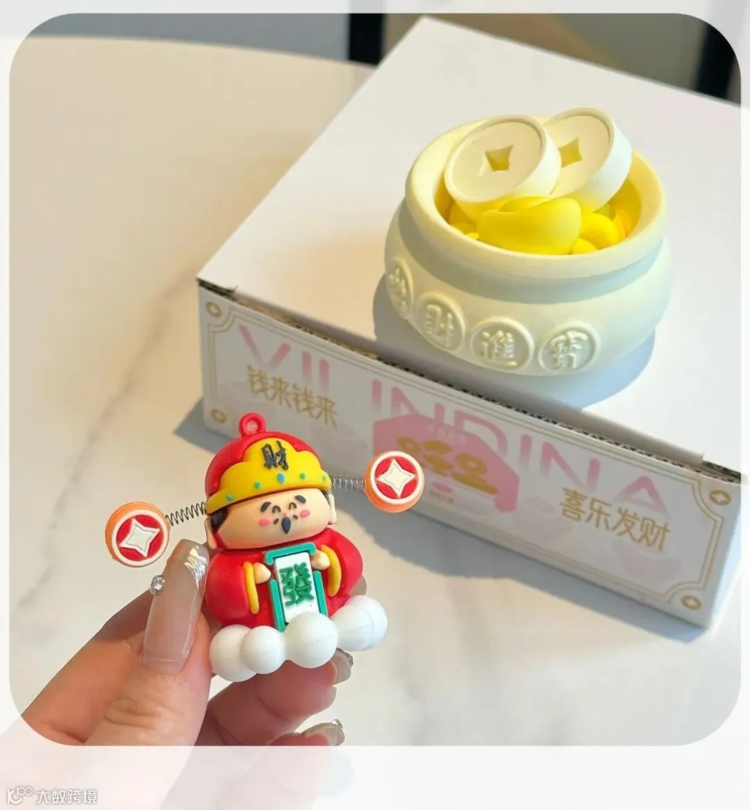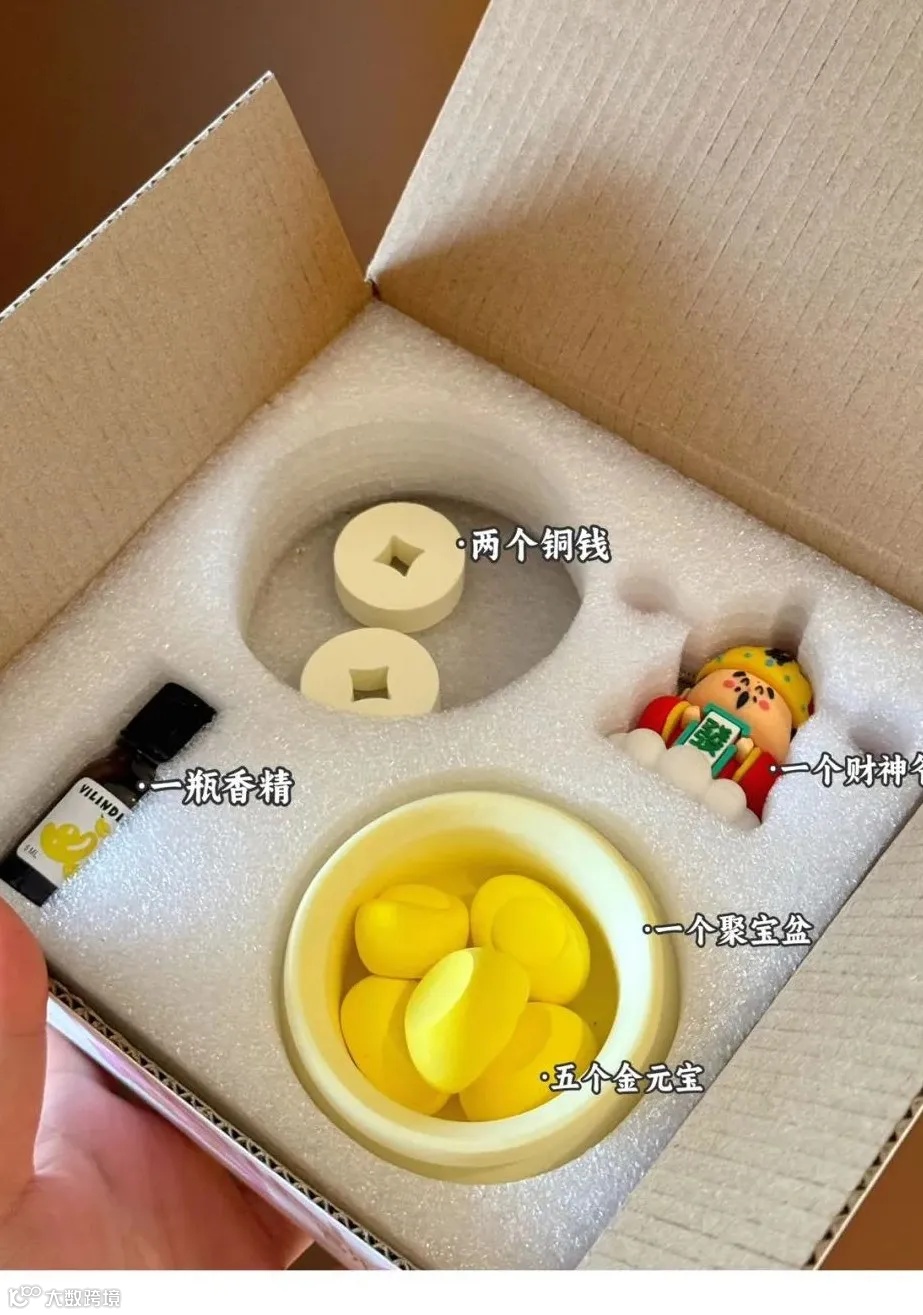 礼盒开启,一尊精致的小财神雕像跃然眼前,手持发财,笑容满面