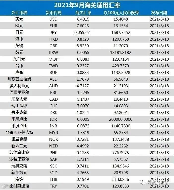 八、2021年9月海关适用汇率