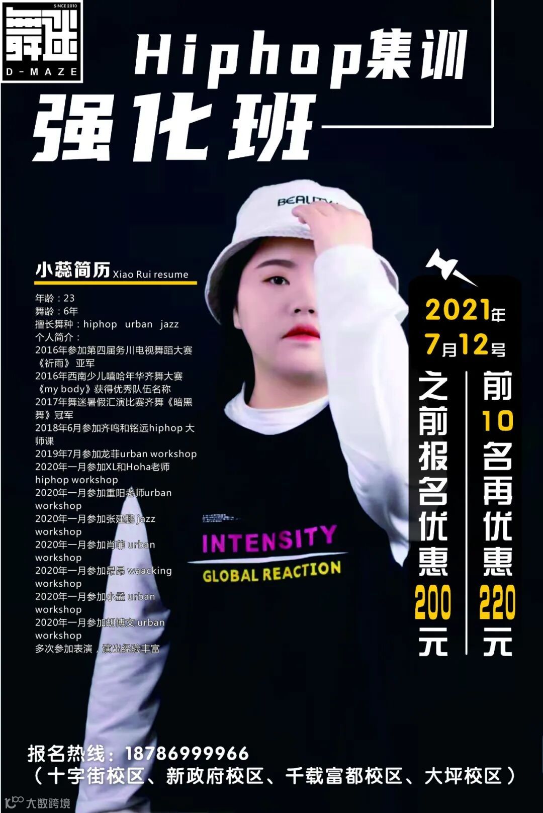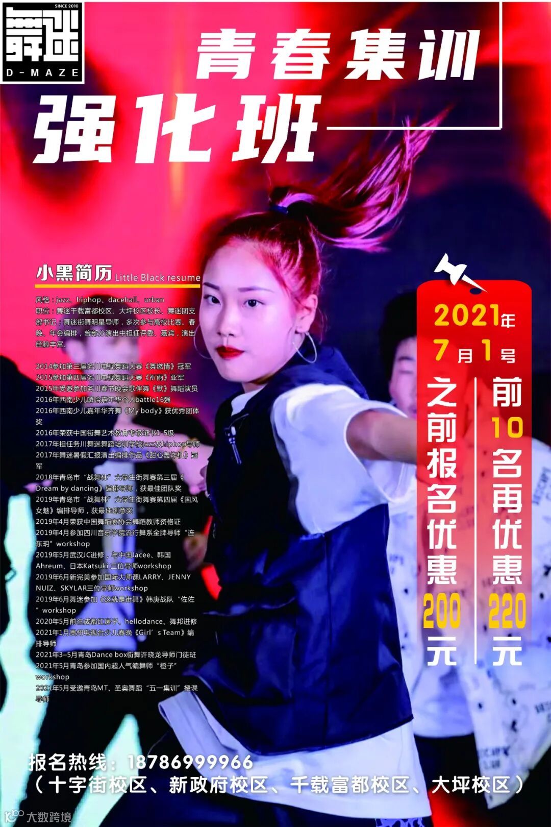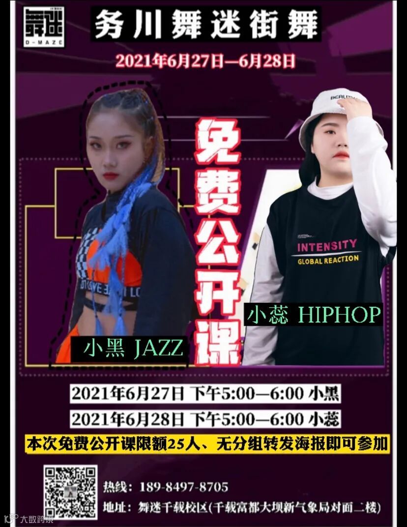 开设舞种:街舞、都市编舞、爵士舞、考级舞、启蒙舞、成人舞、健身舞、HIPHOP、WAACKING等