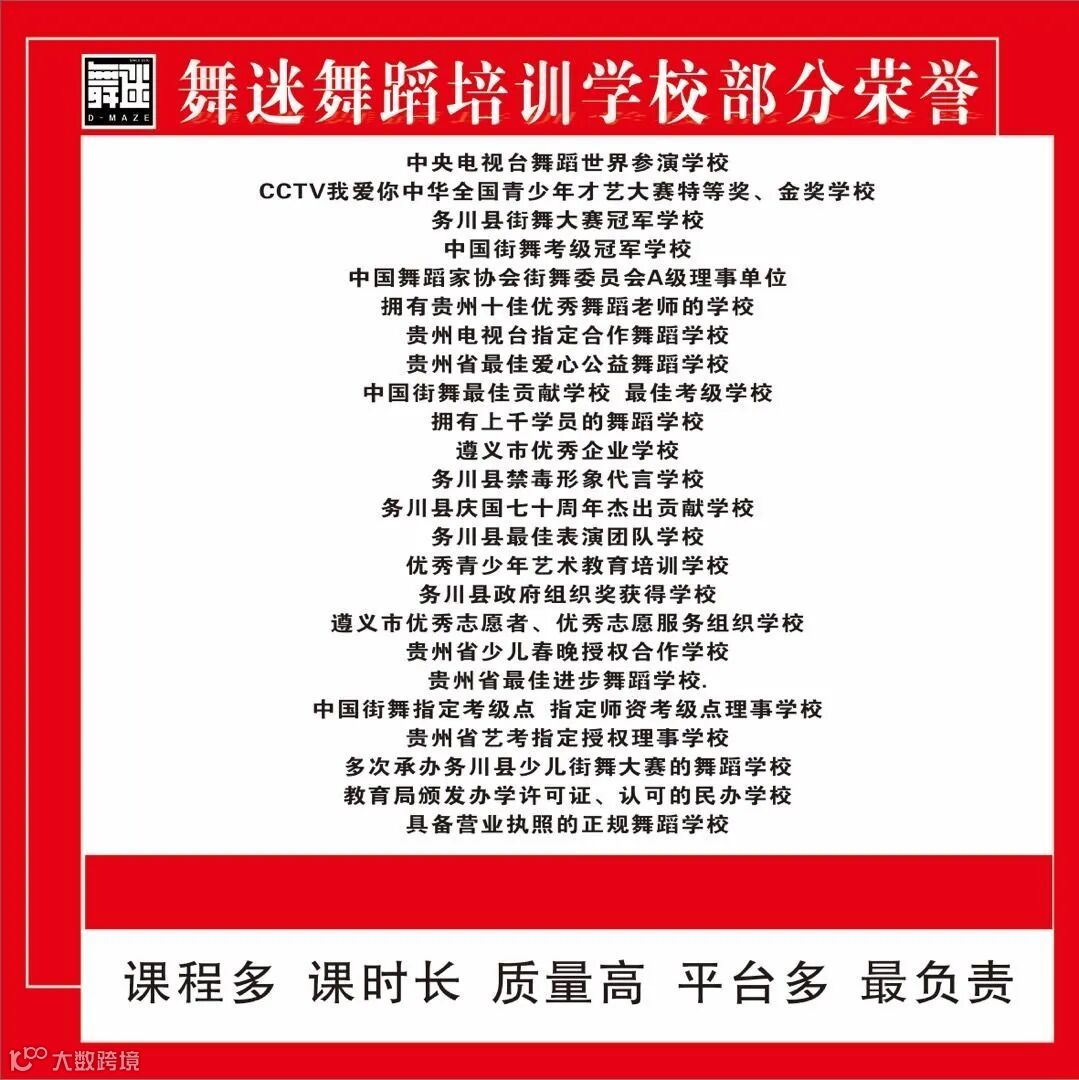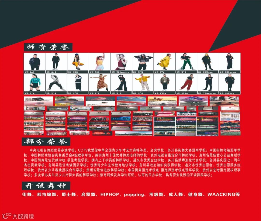务川县舞迷舞蹈学校(中央电视台上榜及获奖品牌舞蹈学校),创于2010年8月8日,资质齐全,是一家专一专业专注做舞蹈培训的非营利性民办学校,每期学员上千人,培育舞者数万人次,是CCTV上榜及获奖品牌舞蹈学校,务川县街舞大赛冠军,CHUC街舞联盟A级理事单位,拥有贵州十佳优秀舞蹈老师,贵州电视台指定合作学校,贵州省最佳爱心公益机构,务川县禁毒形象代言学校,务川县庆国七十周年杰出贡献学校,务川县最佳表演团队,优秀青少年艺术教育培训学校,务川县政府组织奖获得学校,贵州省少儿春晚授权合作学校,青年志愿者协会理事单位,中国街舞指定考级学校,遵义市优秀企业,CCTV我爱你中华全国青少年才艺大赛特等奖、金奖学校,中国街舞最佳贡献学校,中国街舞考级冠军学校,遵义市优秀志愿者、优秀志愿组织,贵州省最佳进步舞蹈学校,中国街舞指定考级点,中国街舞师资指定考级点,爵士舞指定考级点,爵士舞师资指定考级点,贵州省艺考指定授权理事单位,教育局颁发办学许可证、认可的民办舞蹈学校,具备营业执照的正规舞蹈学校...