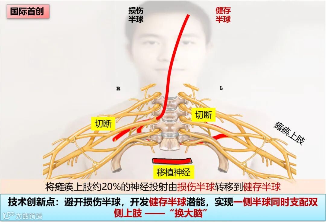 传统对于偏瘫肢体的治疗方法,注重如何恢复损伤的半球。而华山医院团队经过长期研究首次提出,通过左右颈七神经交叉移位的显微外科手术,将瘫痪上肢的神经连接至同侧健康半球,能够实现给偏瘫肢体“换大脑”。