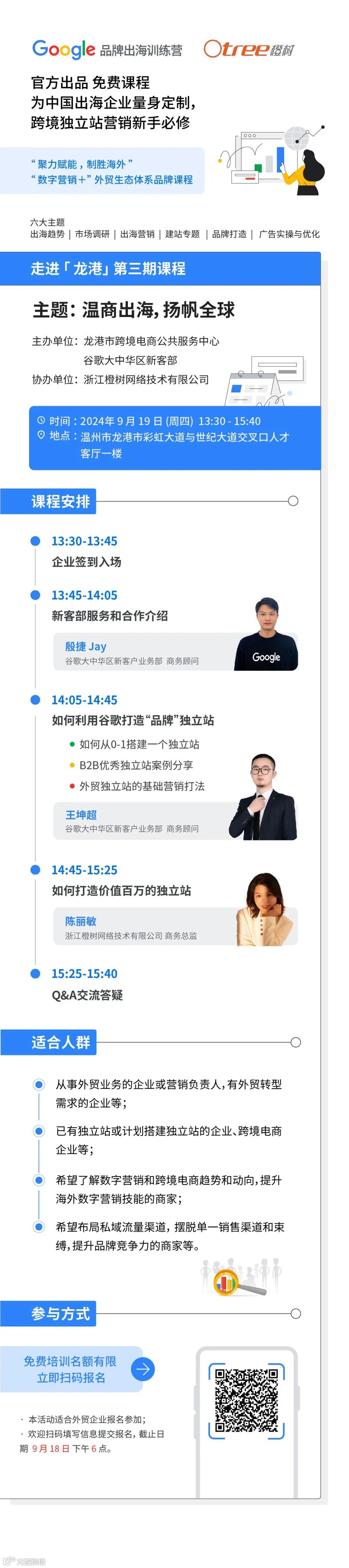 跨境电商作为新的外贸方式、交易模式和经济增长点,有着巨大的市场潜力和生命力。为拓宽跨境电商销售渠道,推动龙港传统外贸企业向电商化转型,Otree橙树协同龙港市跨境电商公共服务中心、谷歌大中华区新客部组织策划了谷歌品牌出海训练营,特邀官方团队围绕出海趋势、市场调研、出海营销、建站专题、品牌打造、广告实操与优化六大主题进行深度剖析,为跨境企业制胜海外提供全链路解决方案。