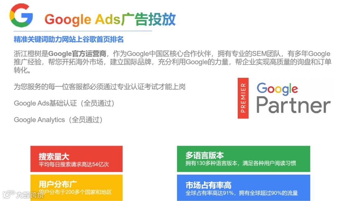 导读:浙江橙树是Google在浙南地区的一家Google官方运营商,作为Google中国区核心合作伙伴,拥有专业SEM团队,有多年Google推广经验,帮您开拓海外市场,建立国际品牌,充分利用Google的