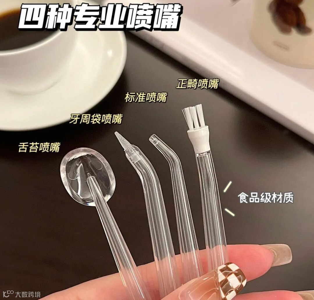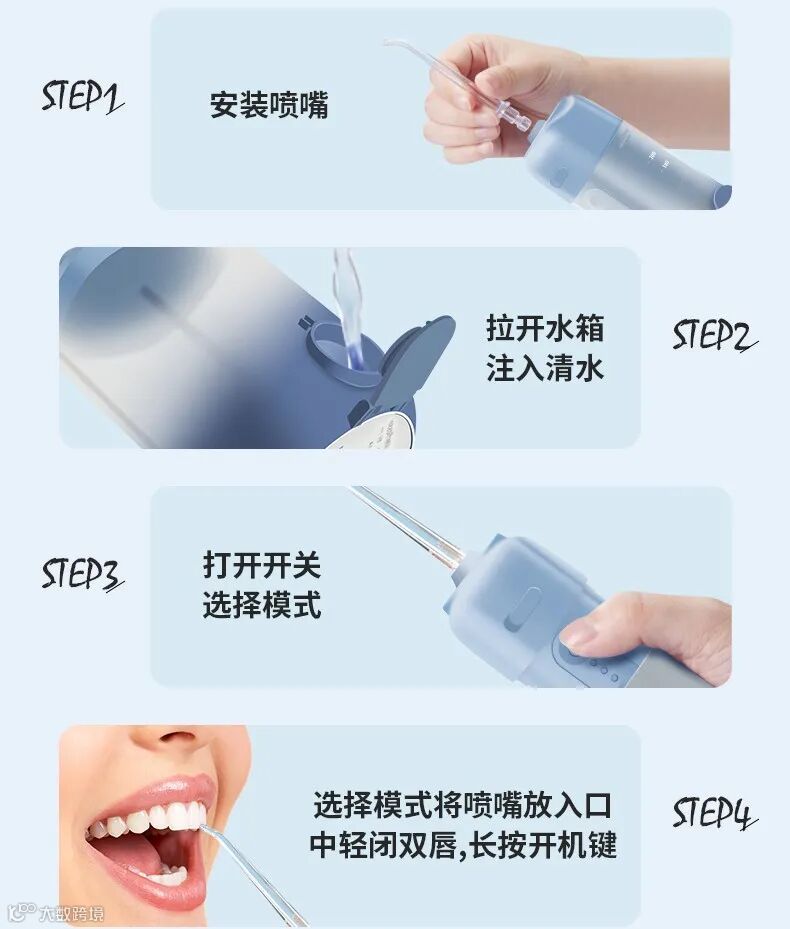 四种喷嘴型号:标准喷嘴、正畸喷嘴、牙周袋喷嘴、舌苔喷嘴,更精细的呵护口腔问题。