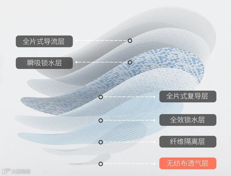 呼吸时代卫生巾防漏是利用导流层、瞬吸层,复导层,复锁层,隔离层5层防渗漏技术,层层锁水,代替PE底膜防漏。