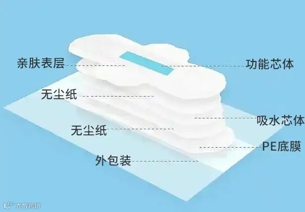 大部分卫生巾是由亲肤表层,导流层,吸收芯层和PE底膜层组成。