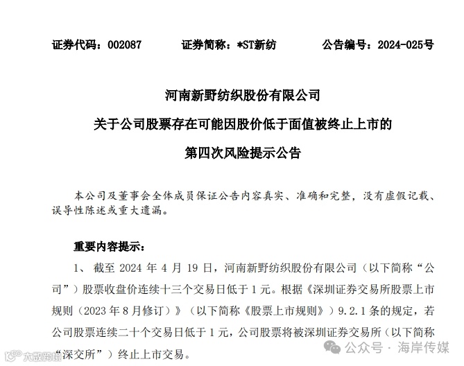 老表们,今儿个儿咱们来扒拉扒拉那个叫“*ST新纺”的破公司。咋的呢?您瞅瞅他,从前是咱南阳的骄傲,如今却要退市了,真是让人大跌眼镜啊!