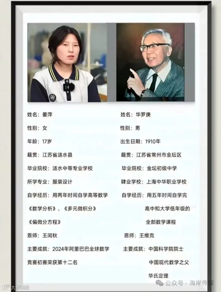 姜萍原本就读于涟水一家服装学校的中专班,学的是服装设计。你说这跟数学有啥关系?那你就错了!这小妮子在学校里就对数学产生了浓厚的兴趣,于是她开始自学高等数学。这可不是闹着玩儿的,高等数学可比初中数学难多了,但姜萍硬是啃下了这块硬骨头。她每天除了上课就是看书做题,连吃饭睡觉的时间都舍不得浪费。