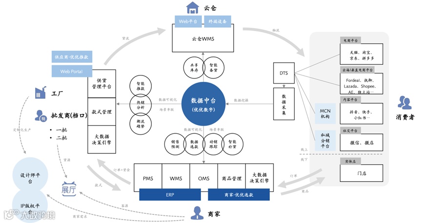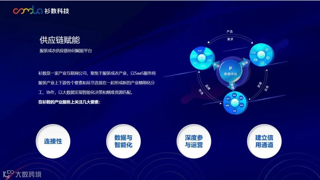 2019年的时候,衫数科技沉淀了上万家上游供应商和四五千家下游商户,于是开始跟中通、京东等交易平台合作,切入到商户交易。