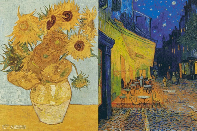 向日葵,绚烂热烈,如一团燃烧的火焰;罗纳河星空,灯影摇曳,神秘浪漫;疯狂的星月夜,星云卷曲,满月成漩涡,只有梵高才能想象。
