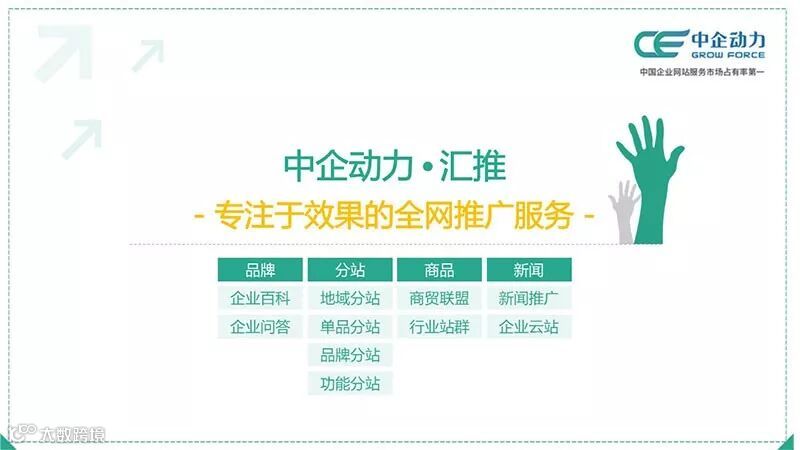 中企动力汇推,帮助企业实现企业信息全网海量布局,占多种媒介,用多种形式,广布网站、内容、询盘入口。深度加工企业信息,形成高质量、有价值的内容 通过高曝光吸引有效流量。汇推将企业、品牌、产品、服务等内容利用互联网资源进行多平台(八方资源、搜狐、新浪爱问、互动百科等),多渠道(商贸联盟B2B平台、新闻推广、分站推广、站群推广、问答推广、百科推广、自媒体推广、微信推广等),多样化的有效推广。