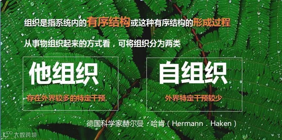 根据德国理论物理学家H. Haken的观点,他讲组织从进化形式上分为两类:他组织和自组织。