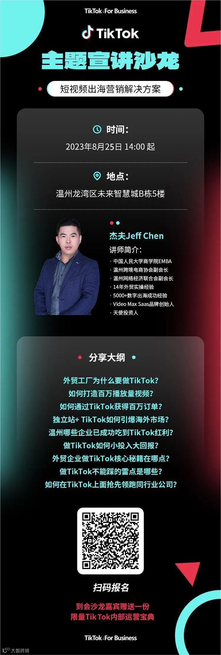 近两年,随着中国制造产品在全球的风靡及消费力的不断释放,中国出口的跨境电商交易规模持续增长。目前,TikTok正步入商业化阶段,并成为众多跨境电商营销的前沿阵地,借助TikTok做投放引流,在TikTok上打造品牌社区,是企业出海关注的重点,入局TikTok将是拓展海外市场的最佳时机。 那么,身为外贸人我们该如何凭借在流量为王的时代下从众多供应商中脱颖而出呢?又该如何利用TikTok平台打开销售渠道、承接外贸订单,提高订单转化率? 本次沙龙邀请到了擅长互联网思维差异化竞争力打造的营销大师陈增开Jeff Chen。Jeff拥有14年外贸实操经验,擅长外贸数字营销整合布局。 Jeff Chen将在本次沙龙中与大家了解在流量为王的时代如何获得流量红利、发掘更多商机,以及分享如何利用TikTok打开销售渠道、如何承接外贸订单,从众多供应商中脱颖而出。 8月25日(本周五) 14:00准时开讲