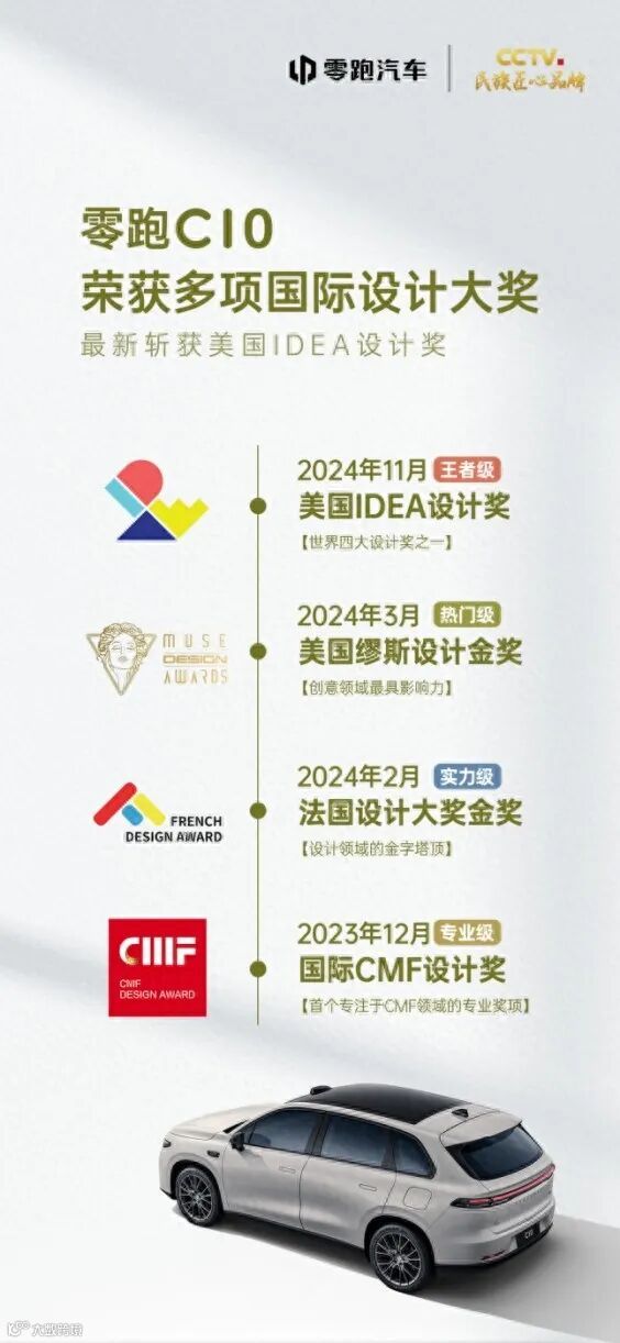 近日,零跑C10荣获2024美国IDEA设计奖(美国工业设计优秀奖),成为继 “2023国际CMF设计奖”、“2024法国设计大奖金奖”和“2024美国缪斯设计金奖”后,零跑C10斩获的第四个世界级设计奖。