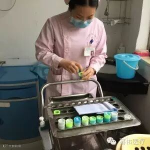 8:40,治疗室内配药。护士小姐说:配药是护士最基本也是最需要集中精力的工作,必须要严格执行无菌操作规程。病人多的时候,常常一口气要配50多瓶药。科里护士的手基本都有了一层薄薄的茧。