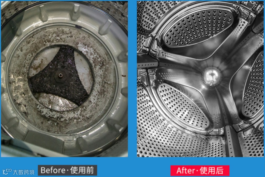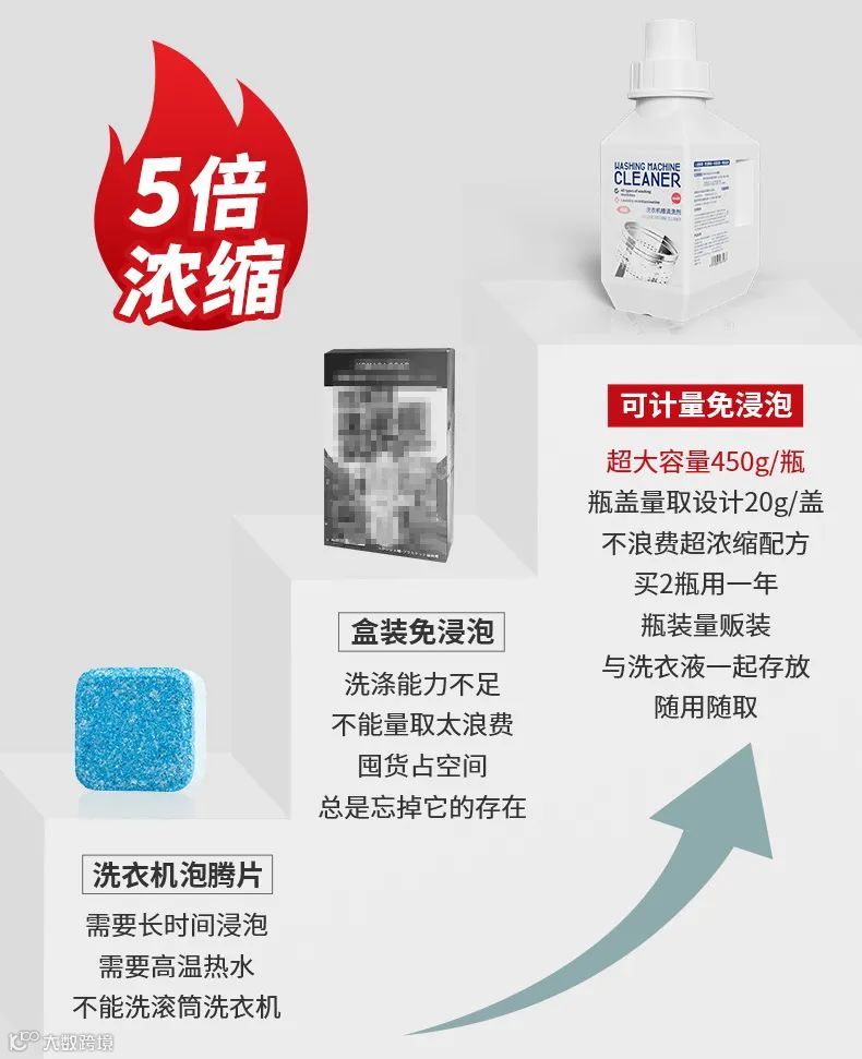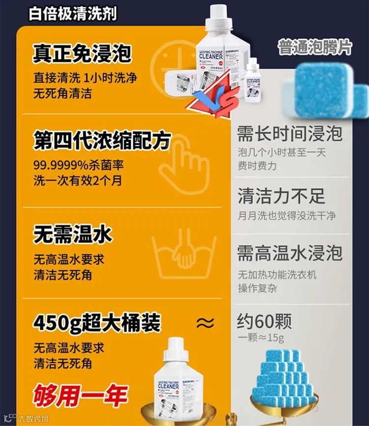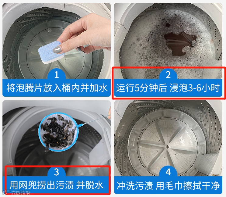 ✘洗衣机泡腾片:需要高温热水长时间浸泡,还不能清洗滚筒洗衣机。