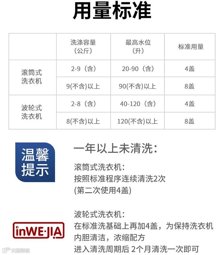 而且溶于水中的inweijia清洁剂能在滚筒的冲击下,随着水流清洁洗衣机的各个角落,360°无死角。