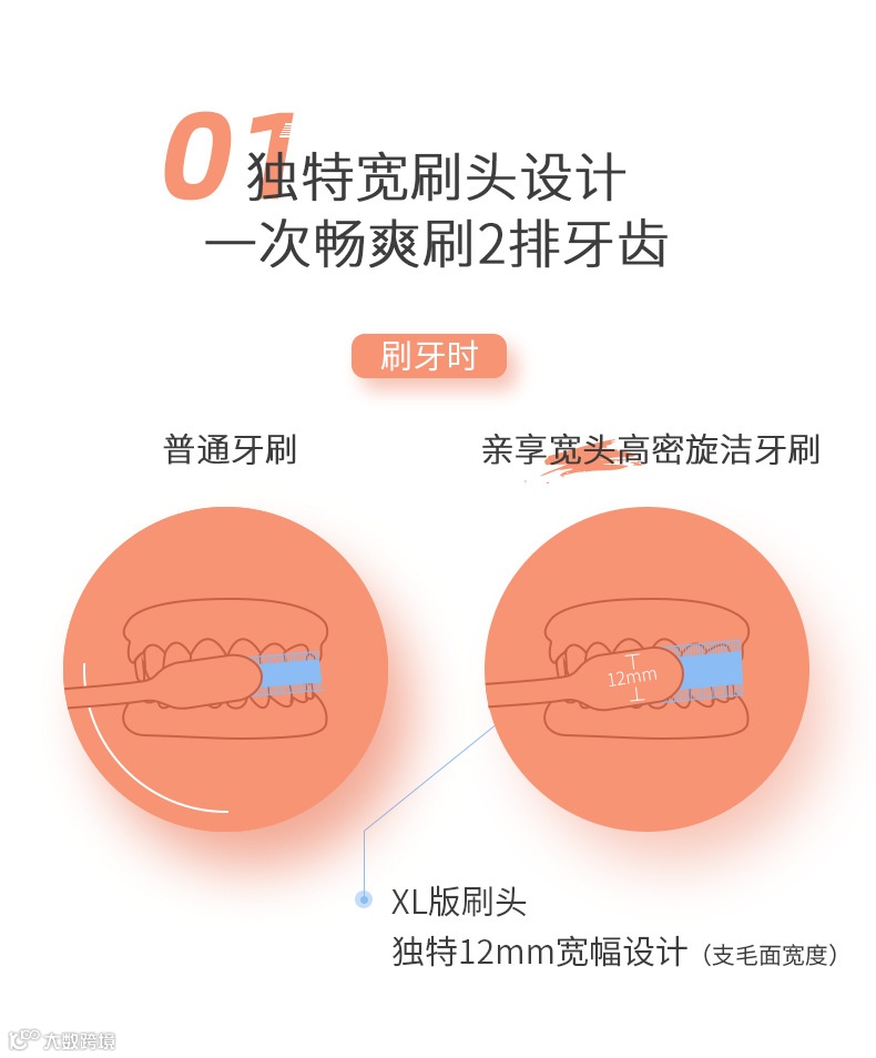 亲享这款宽口牙刷刷毛的直径只有0.12mm,只有头发丝的1/10;