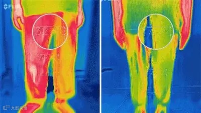 与一般牛仔裤相比天丝裤明显更凉快,用热成像仪查看散热情况,