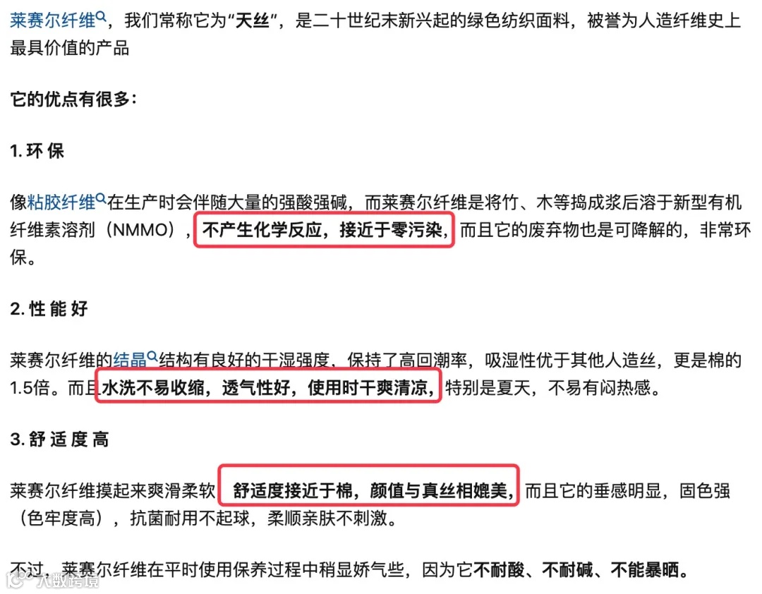 它的面料诚意满满,含72%天然植物纤维纺织而成的莱赛尔天丝,环保天然+透气干爽、比纯棉穿着更轻、看起来很上档次。