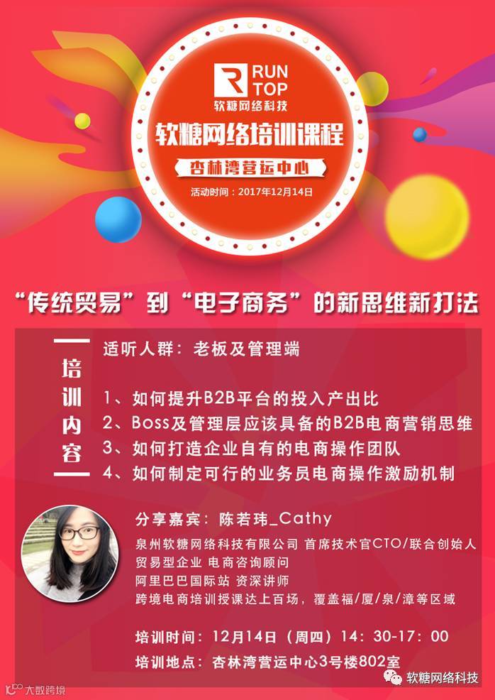 本月软糖网络科技继续为Alibaba国际站赋能培训,将继续在泉晋、厦漳两地举办《橱窗产品/P4P直通车高效提升攻略》、《利用SNS社交及大数据进行买家营销》、《询盘买家背景调研分析策略》、《强营销型2.0全球旺铺最新升级攻略》、《“传统贸易”到“电子商务”新思维》等相关培训,以下培训行程已确认,喜欢学习的外贸小伙伴可联系对应地区顾问报名参加(微信同号):