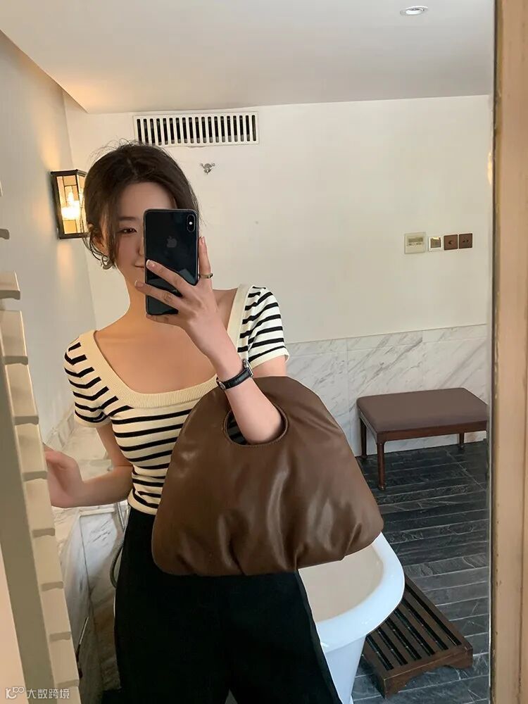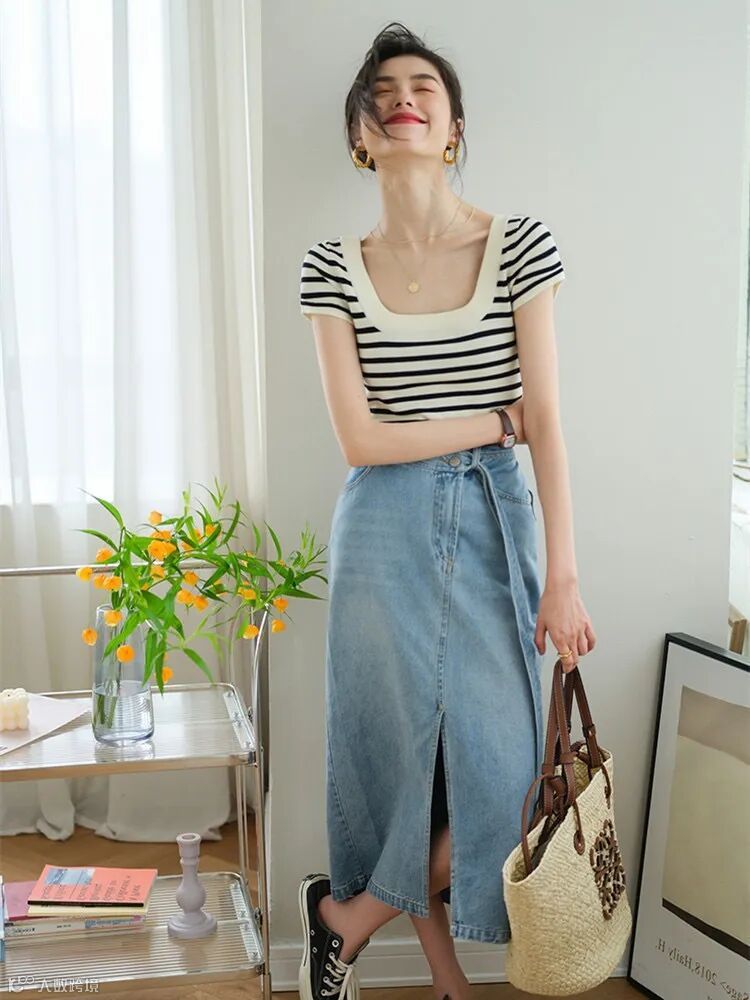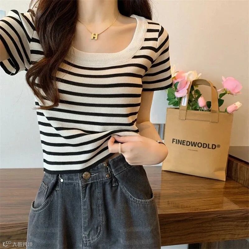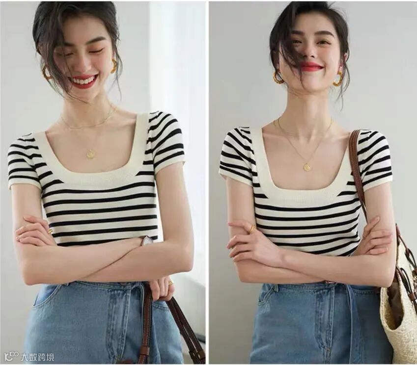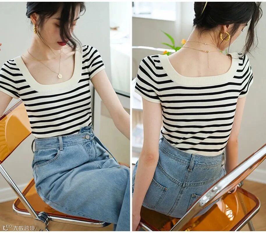 新款U型方领条纹冰丝衫
