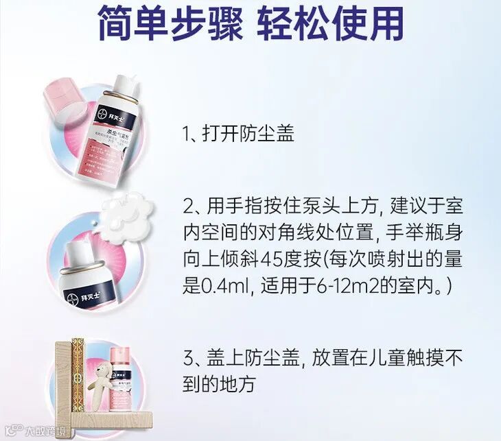 灭蚊实力没话说,睡前往角落一喷,就可以安心去睡觉啦,不用担心被蚊子吵醒。(家有孕妇和小朋友,建议房间施药后半小时后进入)