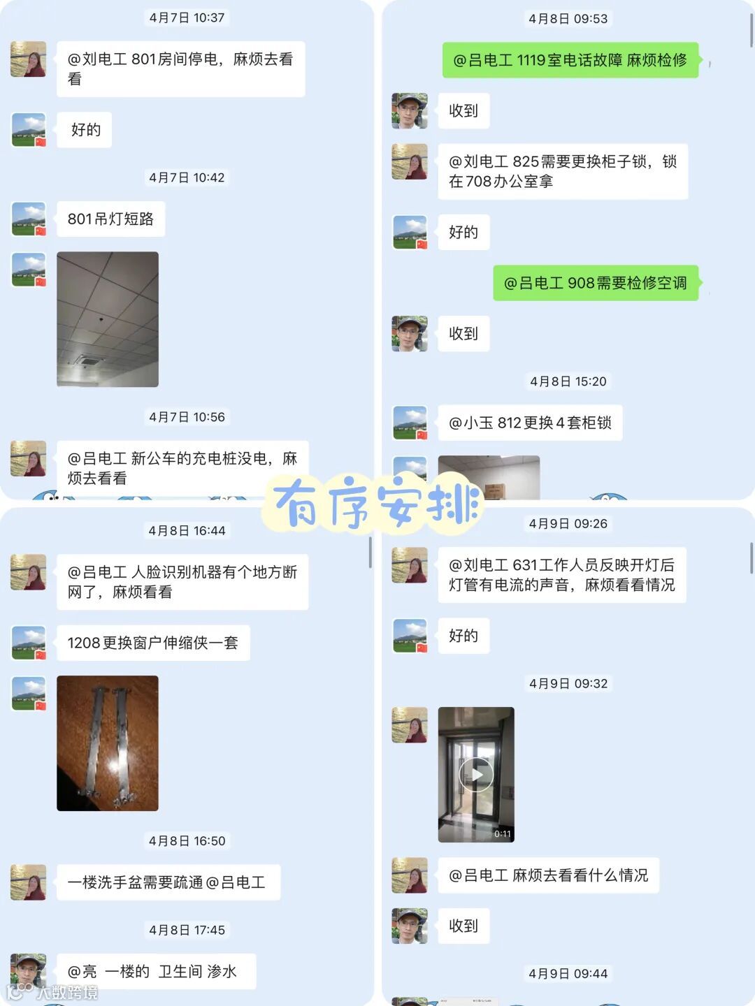 加装浇花定时器,维修大门地弹簧、加固柜子门扣、更换筒灯感应器、检修空调、安装门锁、加固地脚砖、更换水管……工程部一刻也没闲着。