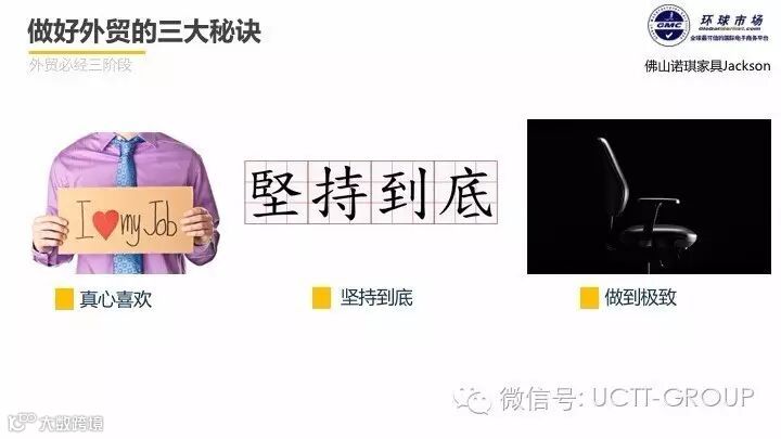 最后,很多人都会问做好外贸有什么秘诀,我认为就三点,真心喜欢、坚持到底、做到极致。真心喜欢是基础,喜欢了才有动力坚持,并且做到极致。举个形象的例子吧,就像我很喜欢一个女孩子,才会坚持到底去追求她,最后做到极致了把她感动了就会答应了,完成了终身大事。我不敢说我现在的工作做到了极致,但是我敢说我是真心喜欢我的工作,然后我才会努力想任何办法把我的工作做到最好,并且坚持到底。笨鸟并不怕,就怕不坚持下来,在此也祝愿各位未来的工作越来越好。首次的网络直播,略有紧张,有不足之处还请各位多多指出。