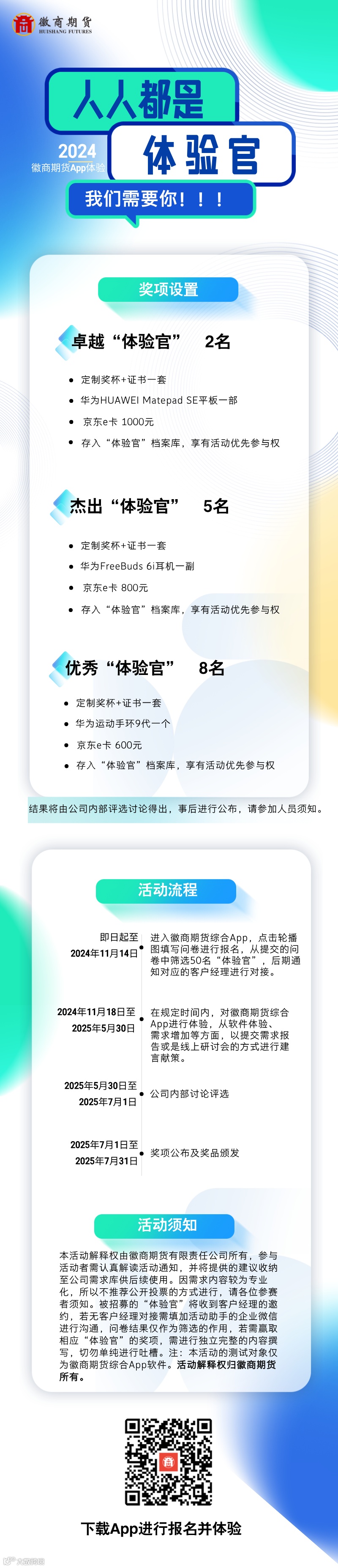 本活动解释权由徽商期货有限责任公司所有,活动者需认真解读活动通知,并将提供的建议收纳至公司需求库供后续使用。因需求内容较为专业化,所以不推荐公开投票的方式进行,请各位参赛者须知。被招募的“体验官”将收到客户经理的邀约,若无客户经理对接需联系徽商期货App企微小助手进行沟通,若想要赢取相应“体验官”的奖项,需进行独立完整的“需求共建单”撰写,切勿单纯进行吐槽。注:本活动的测试对象仅为徽商期货综合App软件。活动解释权归徽商期货所有。