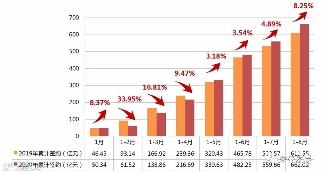 2020年1-8月,公司累计实现签约面积596.87万平方米,同比增长5.52%;累计签约金额662.02亿元,同比增长8.25%。