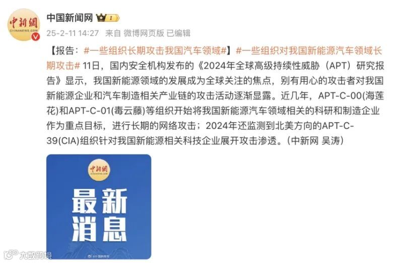 近期,中国新闻网报道,有组织开始将我国新能源汽车领域相关的科研和制造企业作为重点目标。