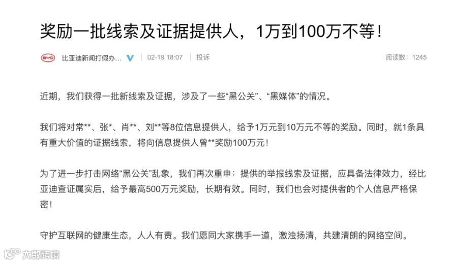 2月19日,比亚迪新闻打假办宣布,对8位“黑公关”相关信息提供人给予1-10万元不等的奖励,同时,针对1位具有重大价值的证据提供人奖励100万元!对黑公关现象零容忍!