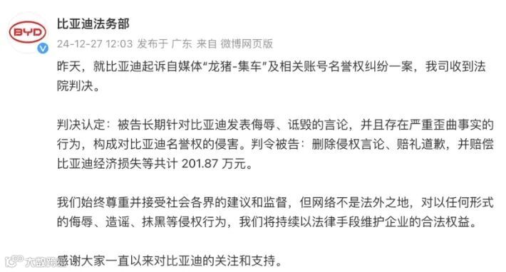在2021年,比亚迪就宣布悬赏5-100万元向全网征集线索。此后,比亚迪把举报奖励提升至5-500万元,长期有效。在近两年的时间里,比亚迪累计起诉20余个“黑号”,同时对30多个重点“黑号”进行密切关注,对其发布的内容及评论区持续做证据保全。