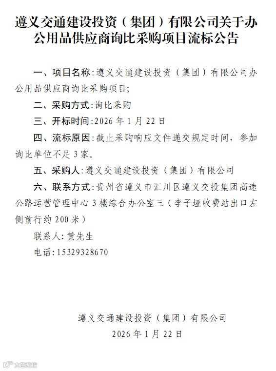遵义交通建设投资(集团)有限公司关于办公用品供应商询比采购项目流标公告