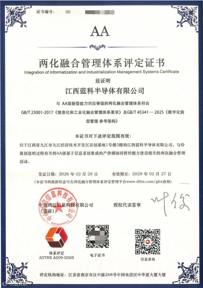 经过专家评审,江西蓝科已顺利通过两化融合管理体系贯标升级认证,获得AA级两化融合管理体系评定证书!