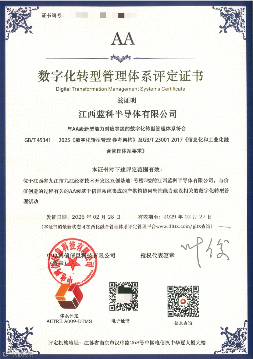 在两化融合发展历程上,江西蓝科自2019年1月正式投产起,通过全面采用自动化设备实现了高精度与高效率的标准化生产。后续不断强化规模化生产优势,不断提升工艺精度,截至2025年,公司已新购置固晶机、焊线机、点胶机、AOI检测机等高效自动化生产设备,进一步提升工业化生产的精细化管理水平。信息化方面,公司于成立之初就构建了统一且高效的业务运营平台,并于2025年3月正式启动了制造执行系统(MES)的筹备工作,从而进一步提升公司整体数智化水平。