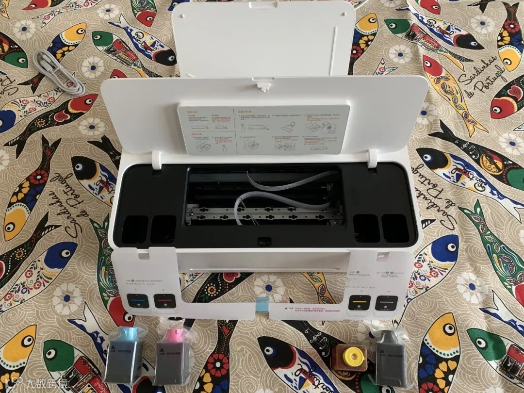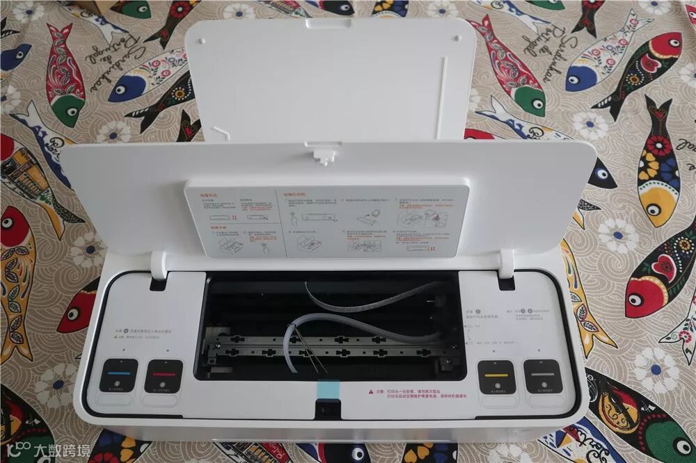 打印机开机后,需要将墨仓及打印头进行安装,米家这款打印机采用了即插即用的内置墨仓设计,机器自带四色墨水位置指示,避免安装错误;墨盒上有安装方向示意,且墨仓使用按压互锁结构,安装及换墨只需一按,超级简单。
