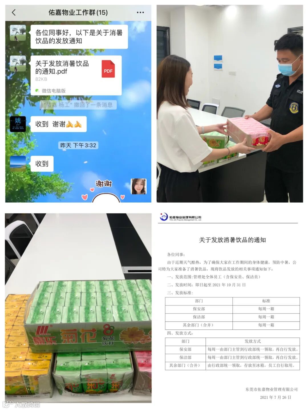 为切实关怀同事们的身体健康,保障各项工作正常开展,佑嘉物业给所有员工送上解暑饮品,感谢他们在炎炎夏日里的坚守和付出。