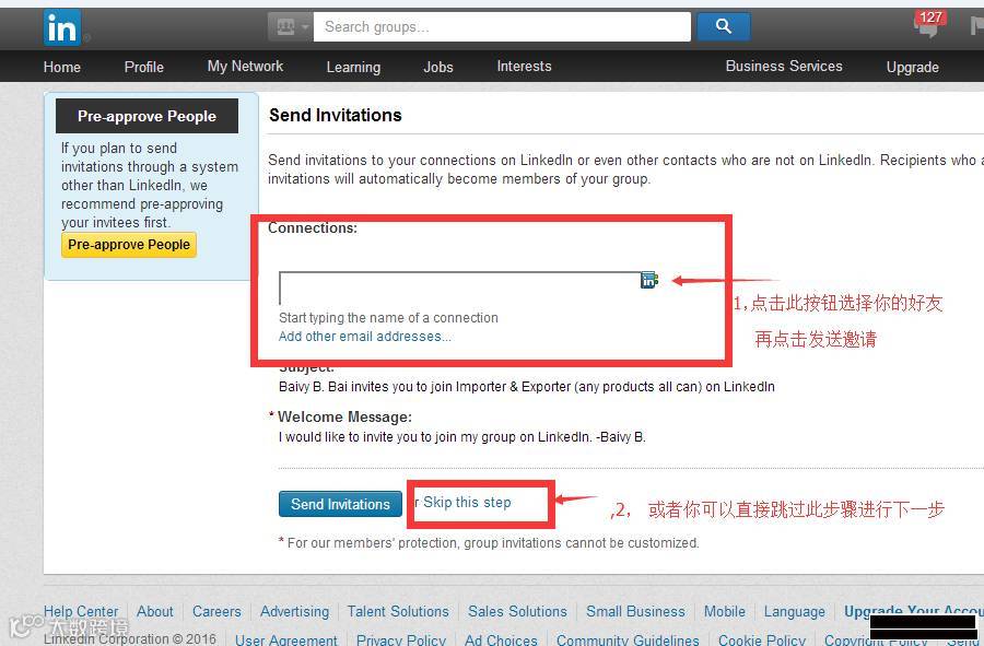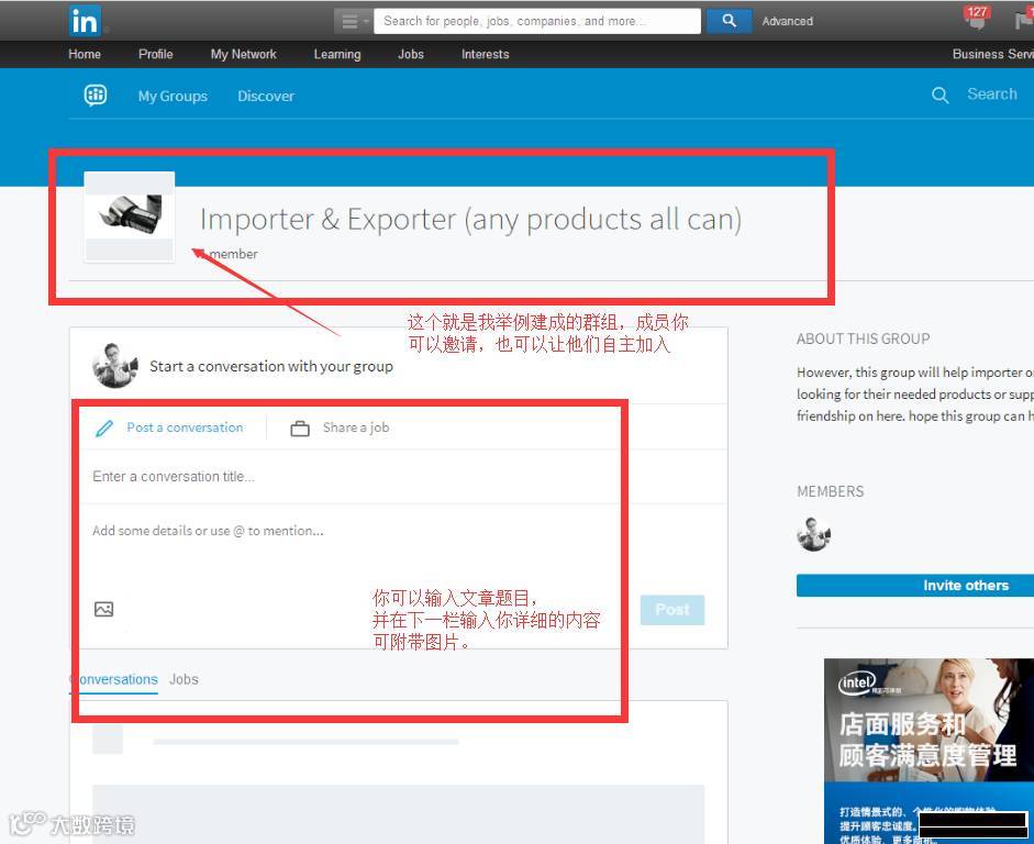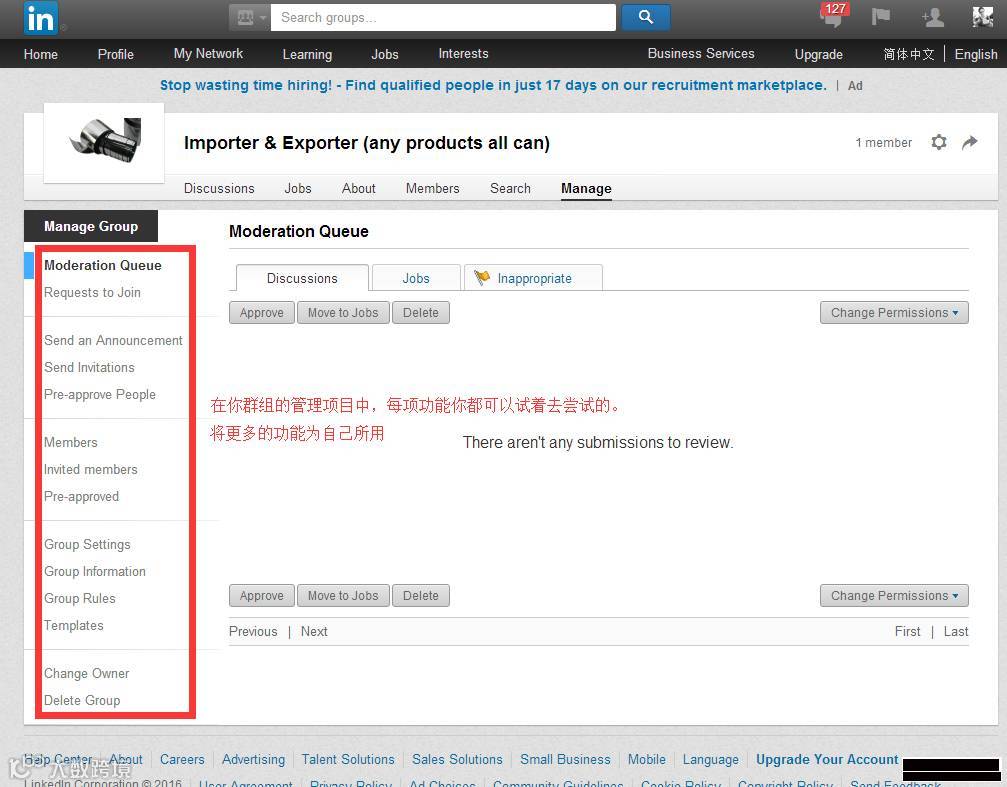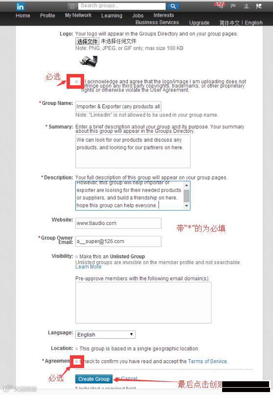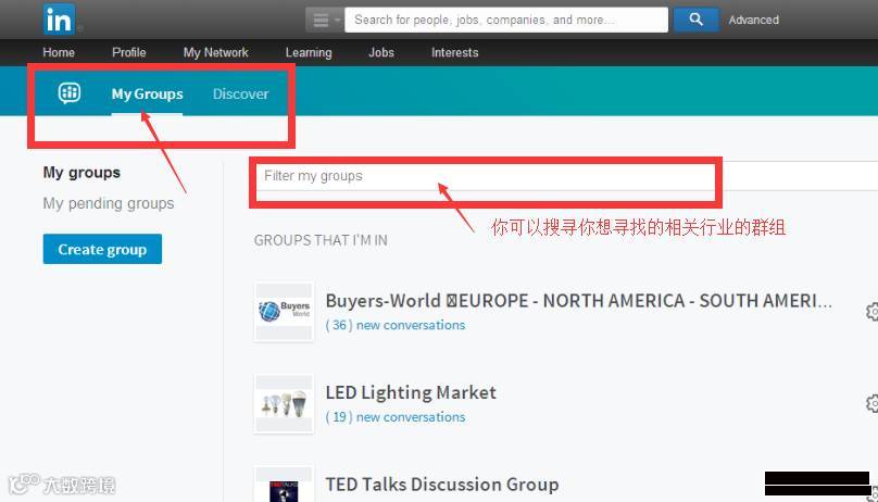 如果你觉得这些群组都跟你行业无关, 你可以建立一个你感兴趣或者有助于推广你的群组,点击:“create group”, 这样你就会得到一个以下显示的内容:
