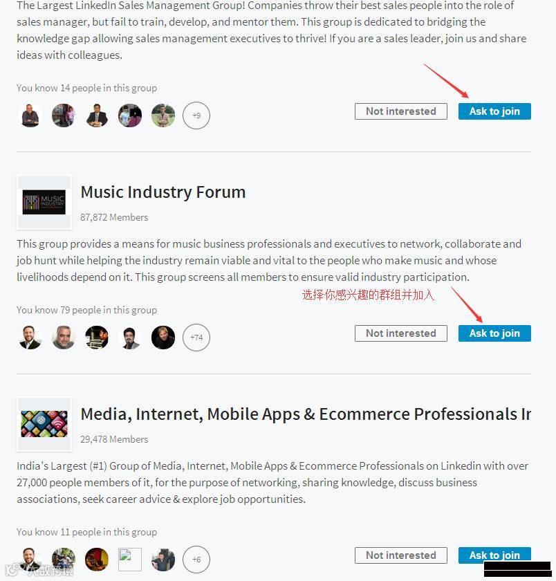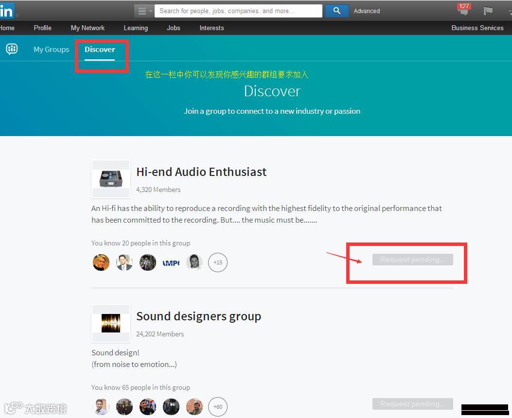 可以在你的:“discover” 一栏选择你感兴趣的群组并申请加入: